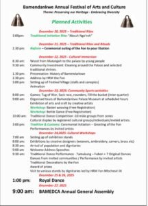 The festival opens with traditional rites and ceremonial activities that highlight the spiritual foundations of the community, followed by days of cultural immersion and collective engagement. Community members participate in palace-centered activities, historical presentations, cultural clean-up initiatives, and the establishment of a vibrant festival village. Arts and crafts exhibitions, traditional dance competitions, music, storytelling, and creative workshops provide platforms for both established and emerging talents, while guided tours of the palace museum offer deeper insight into Bamendankwe history and governance.